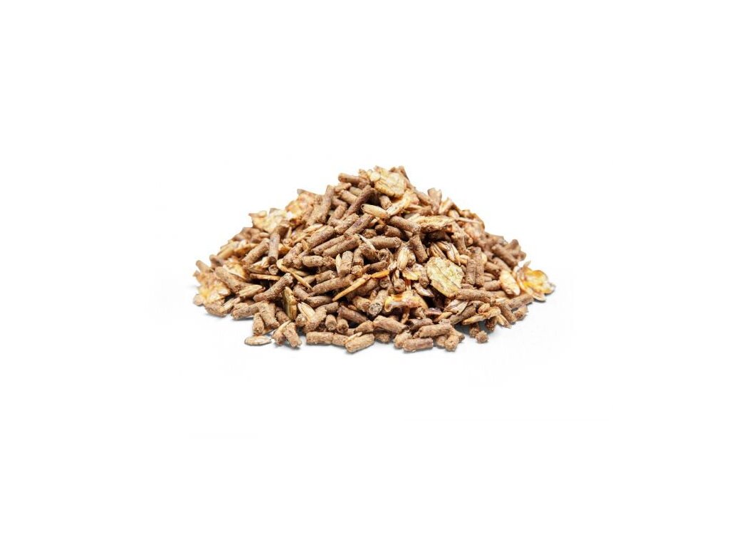 pšeničné otruby a endosperm, sójové slupky, melasa, napařované vločky ječmene, napařované vločky ovsa, slunečnicové expelery, vločky kukuřice, rýžové otruby, hipro sója, uhličitan vápenatý, sójový olej, vitamino - minerální premix, rostlinný olej