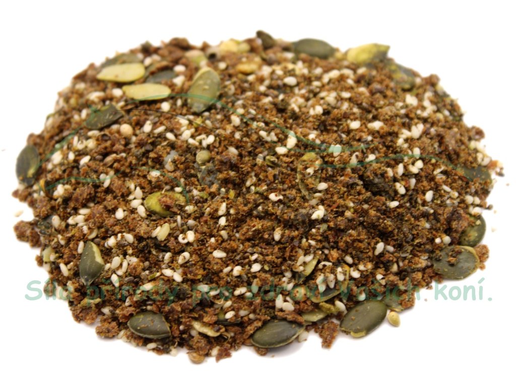 Složení: Extrudované lněné semínko, extrudovaný ostropestřec, konopný šrot, dýňové semínko loupané, sezamové semínko loupané, chia semínka.