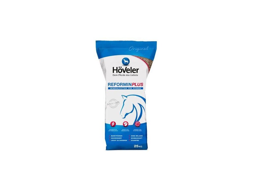 Höveler Reformin Plus je vitaminový a minerální doplněk pro koně všech plemen, všech věkových kategorií a jakéhokoli využití, který podporuje správné fungování celého metabolismu, a tím předchází vzniku různých nedostatků, které se potom mohou projevit jako například kožní problémy, poškození kopyt nebo chudokrevnost. Tento unikátní doplněk vznikl na základě nejnovějších vědeckých výzkumů a zkušeností s úmyslem zaplnit výživové mezery v denní krmné dávce pro koně.